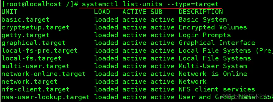 所谓的运行级别,不过指的就是一个 target 组设置成开机启动,下面用 systemctl 显示所有的 Units,并指定 Unit 的类型为 target