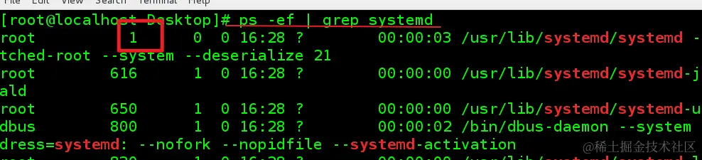 进程 PID 是 1,说明是头一个进程,老版本的 CentOS 第一个进程叫做 init