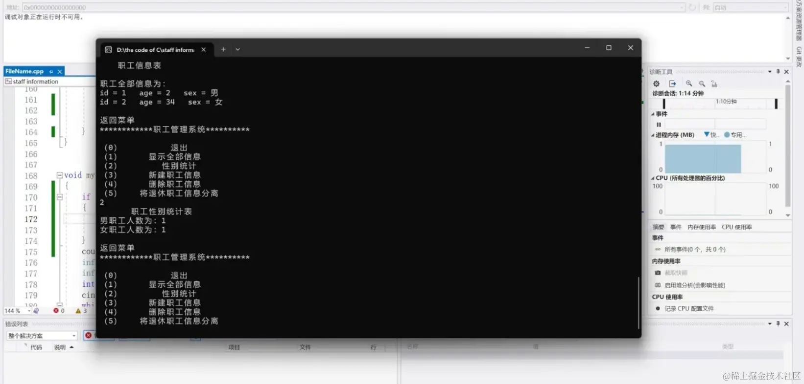 这一题很明显需要使用链表,所以我创建了一个结构体类型用来存放职工的编号、年龄、性别以及指向下一节点的指针,然后声明自定义函数。在完成这些后,我就开始编写主函数了,首先当然是建立一个头指针指向空,然后在do...while循环中显示菜单,使用switch根据用户输入的数字调用相关函数实现相应功能,或退出程序。