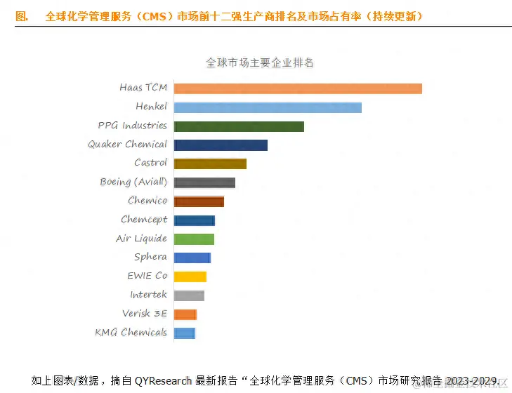 全球化学管理服务(CMS)(Chemical Management Services,CMS)主要厂商有Haas TCM、PPG Industries和Henkel等,全球前三大厂商共占有超过40%的市场份额。