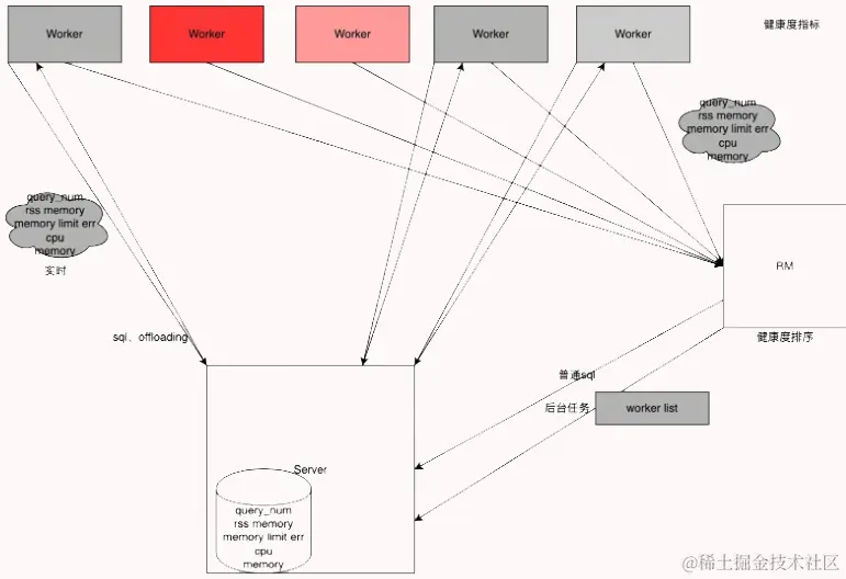 - 建立 worker 健康度机制。Server 端建立worker 健康度管理类,可以快速获取worker group 的健康度信息。包括cpu、内存、运行query数量等信息。