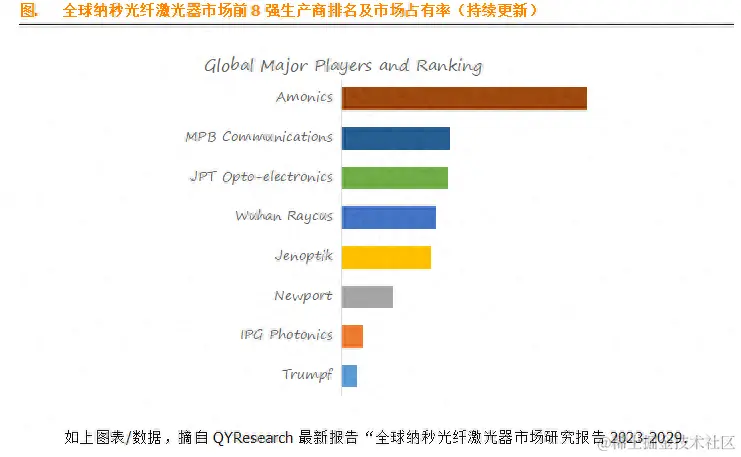 全球范围内,纳秒光纤激光器主要生产商包括Jenoptik、Wuhan Raycus、JPT Opto-electronics、MPB Communications和Amonics等,其中前五大厂商占有大约60%的市场份额。