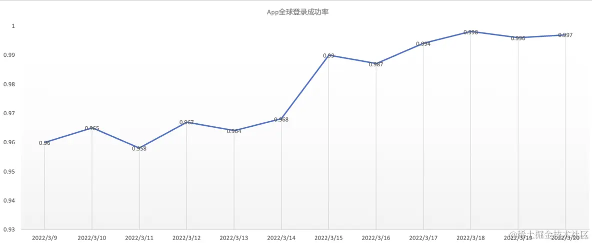 以使用统一接入方案前后业务成功率对比,某 App 在 2022.03.14 开启统一接入之后,登录成功率由 96% 提升到 99%。