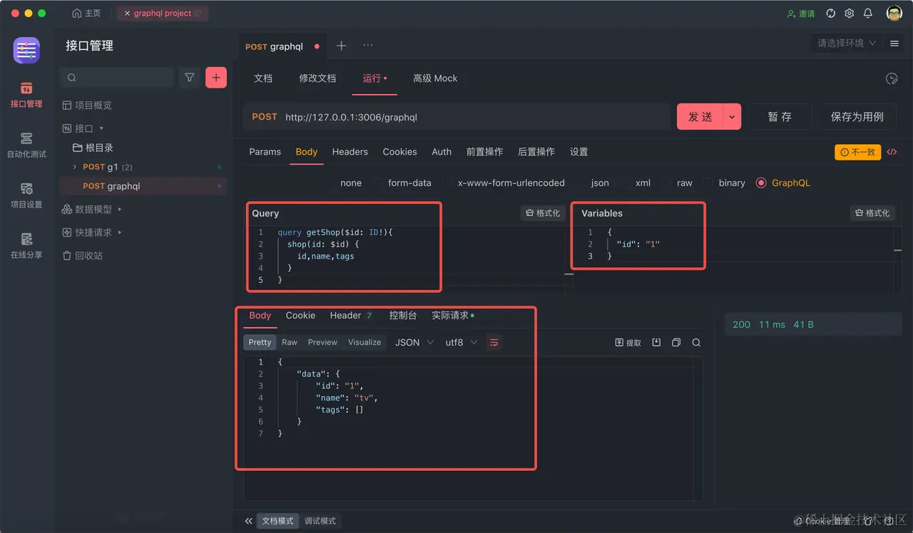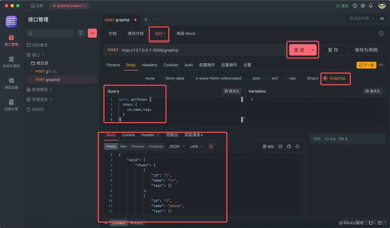 跳转到 运行页面,Body 格式选择 graphql,并且填入 query 语句,点击 发送 按钮,即可查看到 Response,可以看到是我们预期的数据,非常棒!