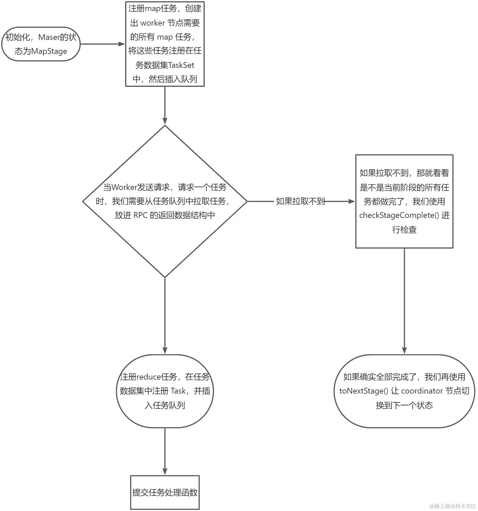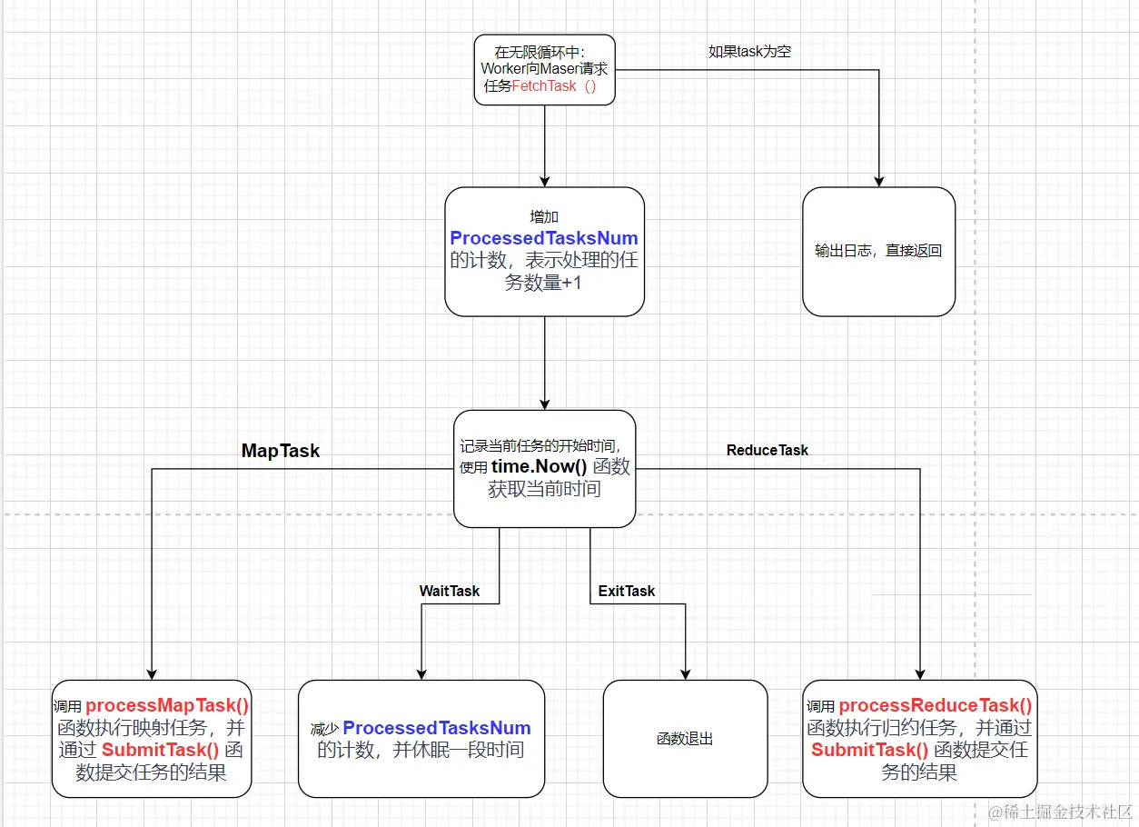 - 重复7-9。 直到coordinator不再分配reduce任务,worker等待coordinator结束消息,然后退出结束