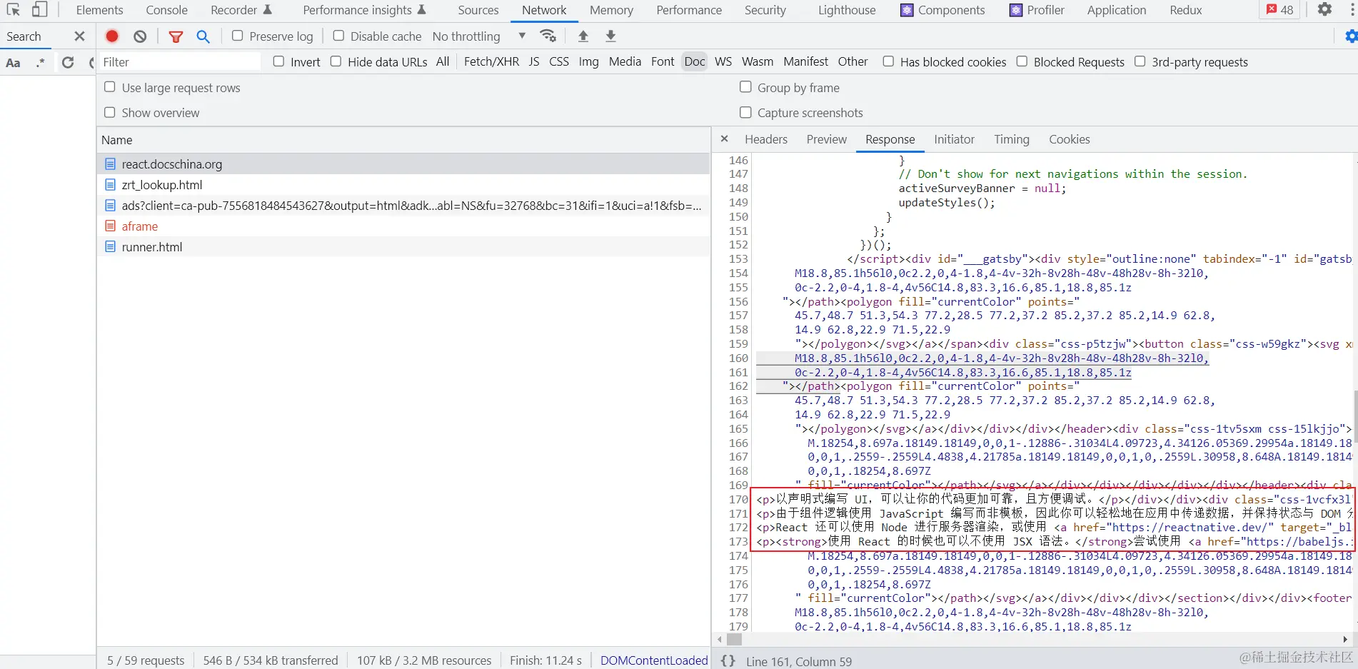 当我们打开控制台之后,点击network并选择 DOC文档请求,就会发现有一个请求路径为https://zh-hans.reactjs.org/ 的GET请求,响应结果为一个 html文档,里面刚好能找到对应上图中红色区域文字的文本,这也就佐证了这个html文档所对应的页面就是react官网首页,而这种渲染页面的方式只有两种,一种是服务端渲染 SSR,还有一种是静态站点生成 SSG