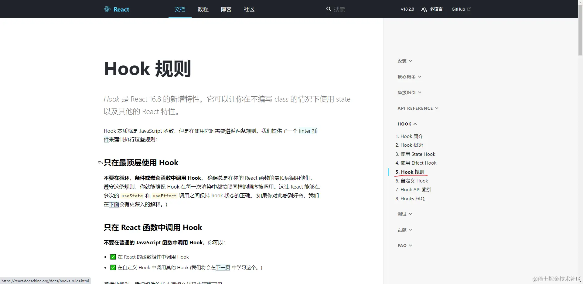 研究完首屏渲染之后,我们再来研究一下路由跳转后内容的切换。经常看 react 文档的朋友可能早就发现了,其路由跳转无比丝滑,感觉就像是一个静态页面一样,完全没有发送网络请求的痕迹,比如我现在处在hook 简介这一个板块,当我点击 hook 规则 目录之后