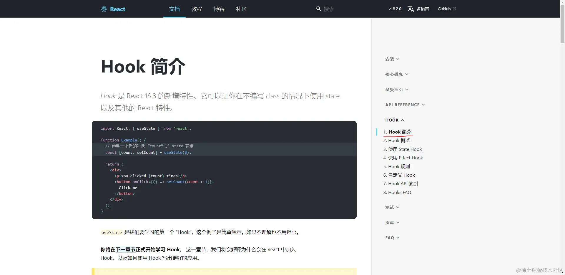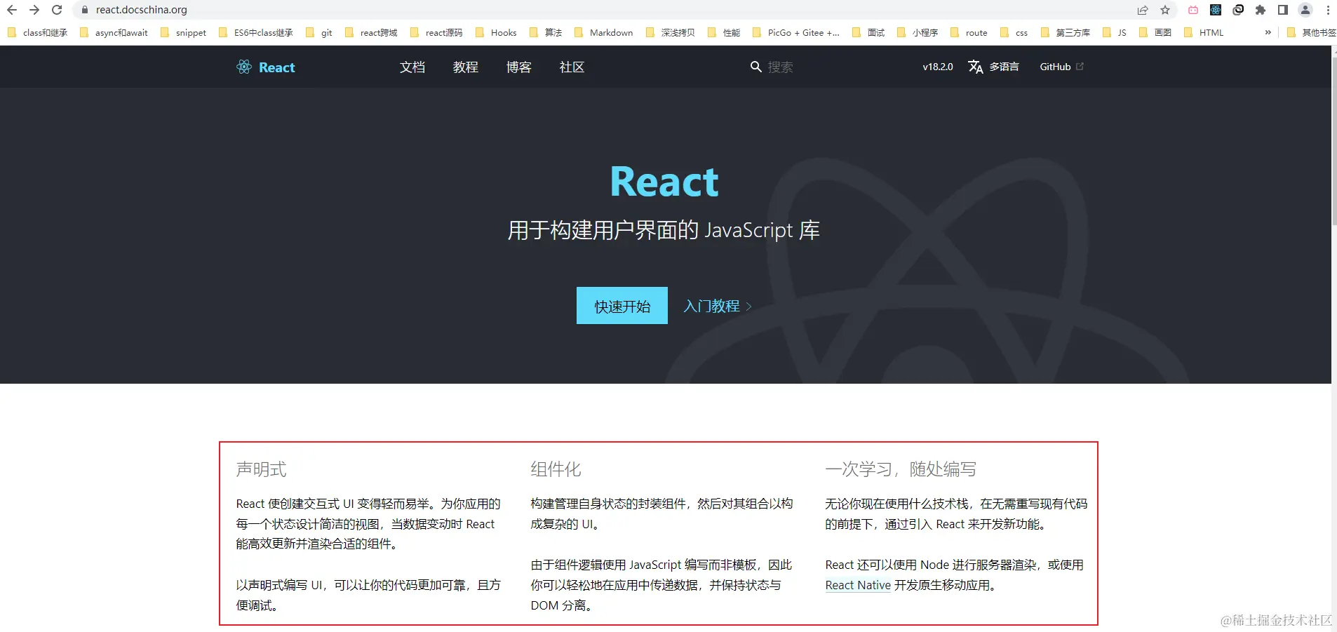 下面是react官方中文文档首页的截图,大家注意下方的红色区域,后面会作为推断的一个理由