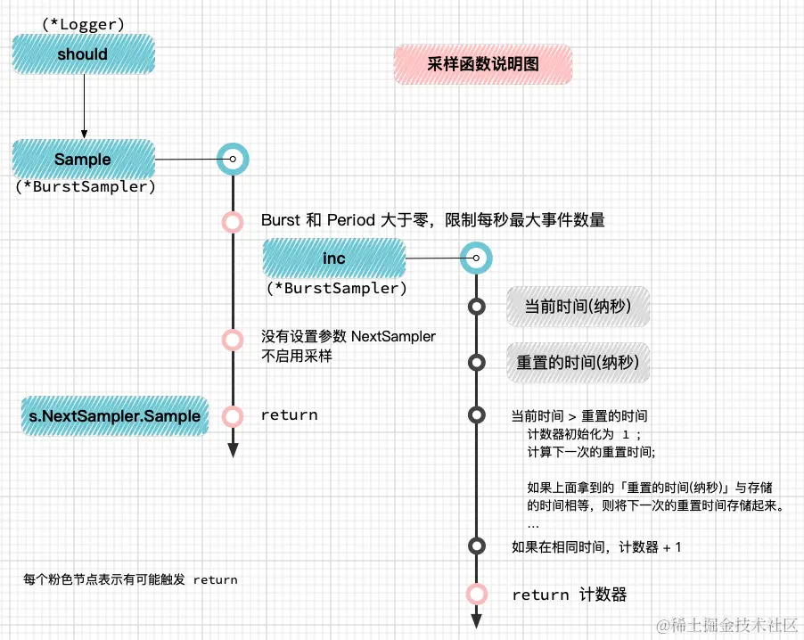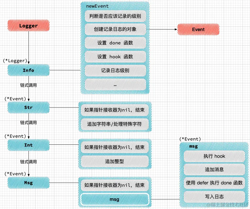 Info 函数及其他级别函数都会调用 newEvent,在该函数的开头, should 函数用来判断是否需要记录的日志级别和采样。