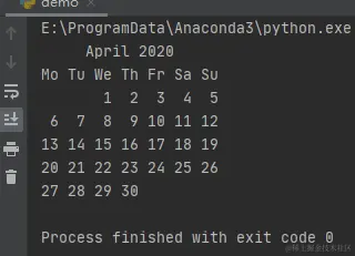 可以看到,日历开始是从星期一开始的。这是因为我们通过函数TextCalendar()指定了日历的开始星期。这里,读者可以自行指定任意一个星期几。