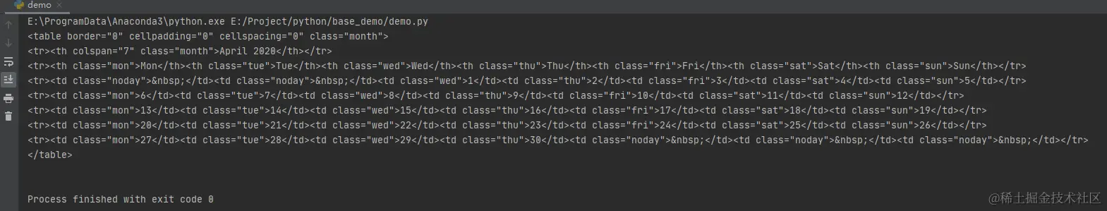 这里,我们会直接返回HTML表格定义的日历格式。在使用Django开发时,这个方法非常好用。而且,细心的读者肯定看到了这里每一个标签都有class,在实际的使用中,可以通过CSS丰富这个日历的样式。