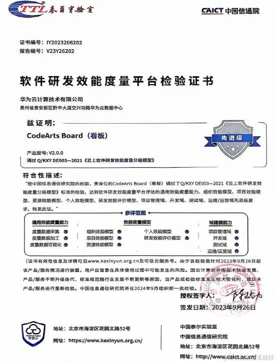 9月26日,华为云CodeArts Board获得了中国信通院《云上软件研发效能度量分级模型》的先进级最高级评估,达到了软件研发效能度量平台评估的通用效能度量能力、组织效能模型、项目效能模型、资源效能模型、个人效能模型、研发效能评价模型、项目管理域、开发域、测试域、运维/运营域的先进级要求,所有能力项要求全部通过,华为云CodeArts Board成为国内研发效能度量领域能力全面领先的云服务。