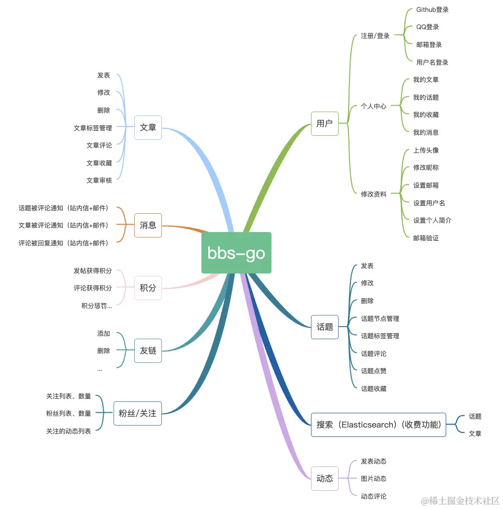bbs-go 为前后端分离设计,后端接口服务使用简洁的Go语言进行开发,前端页面使用Vue.js进行开发。本系统模块如下: