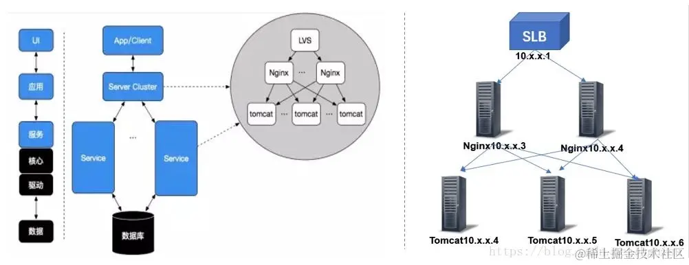 技术架构:确定组成应用系统的实际运行组件(lvs,nginx,tomcat,php-fpm等),这些运行组件之间的关系,以及部署到硬件的策略。