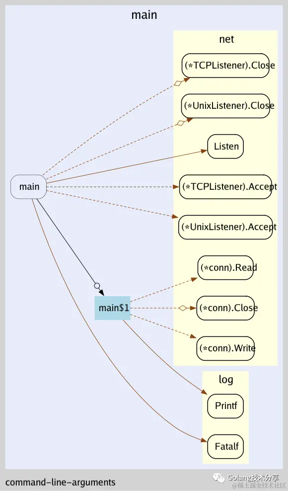 以上是一个简单的TCP服务端代码,通过 go-callvis 工具,可将其代码调用关系梳理出来。