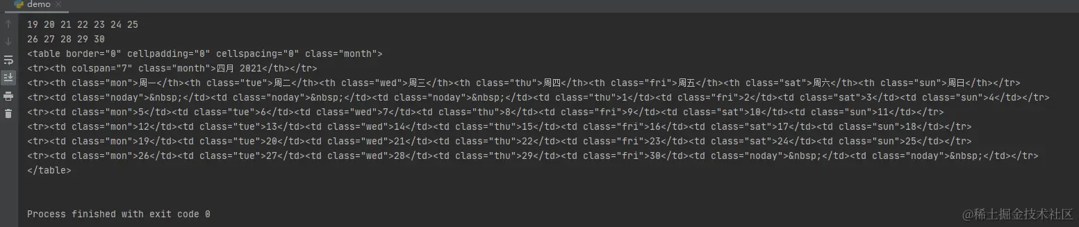 运行之后,我们会得到一个日历字符串形式数据: