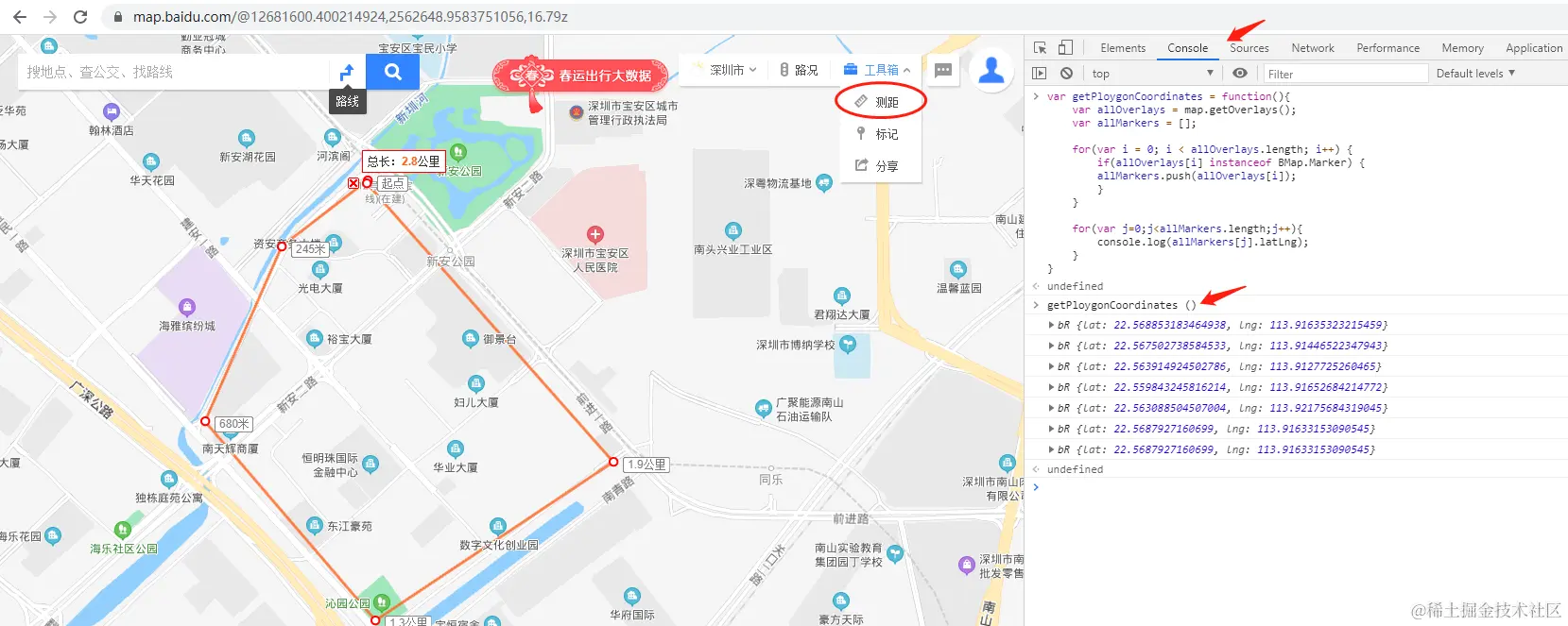 - 然后在console里输入getPloygonCoordinates()并回车执行,就把对应的图形坐标点输出出来了。