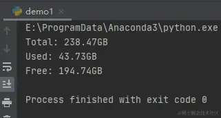 这里博主是获取电脑E盘的信息,比如这里获取到E盘总大小total为238G,已使用Used为43G,未使用Free:194G。一个健壮的程序必然很严谨,所以在操作文件时,特别是比较大的文件时,一定要判断磁盘的大小之后再操作。
