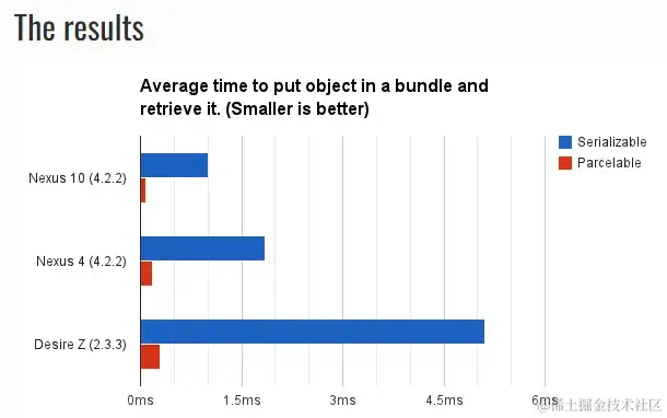 数据来自parcelable-vs-serializable,实验结果对比Parcelable的效率比Serializable快10倍以上。
