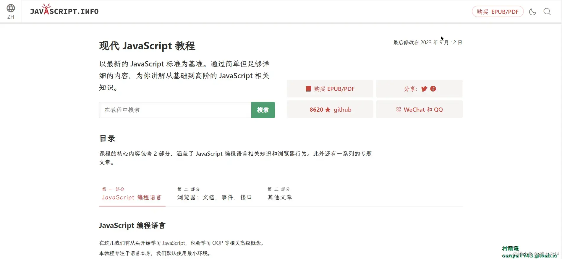 依托于 learn.javascript.ru 而来,它是俄罗斯最大的 JavaScript 教程和学习平台之一,质量有保障,而且是在线学习,教程都是实时更新且免费的,不像书籍可能存在看的技术过时的问题。现代 JavaScript 教程是 React 官方文档中与 MDN 共同推荐的 JavaScript 学习教程,质量有保障。