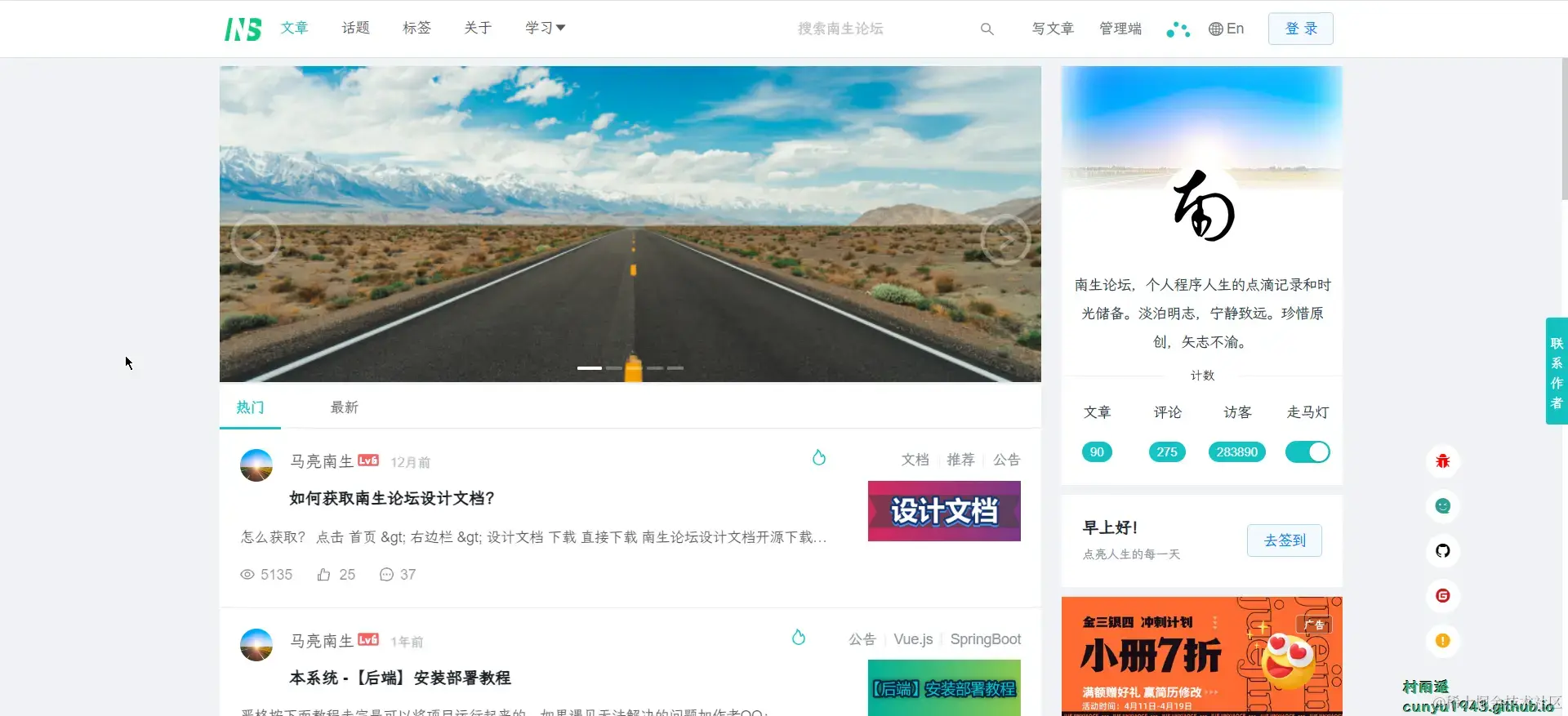 仿掘金之南生论坛基于 SpringBoot + Vue 框架实现前后端分离(大厂微服务架构设计;代码简洁、高效无冗余;注释详细易阅读),自适应手机端和电脑端,界面简洁美观,功能完善,性能高效。