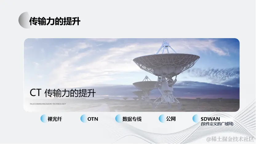 对于信号传输技术,我们经历了从裸光纤到OTN的传送网络、再到数据专线以及现在的公网和SD Wan网络。