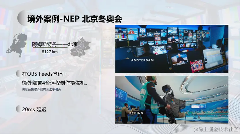 在2022北京冬奥会的转播中,美国全国广播公司NBC、联合NEP,在速度滑冰项目中,为了拍摄荷兰选手的特写镜头,在速滑馆冰丝带中,单独架设了4台IP摄像机,通过远程传输的方式,直接接入了位于阿姆斯特丹的制作中心的系统中。采用了JPEG-XS压缩格式进行传输,传输延迟控制在了20ms。这在跨国甚至是跨洲际的浅压缩远程传输中,不论是信号质量还是信号的稳定性方面,都是一个质的飞跃。