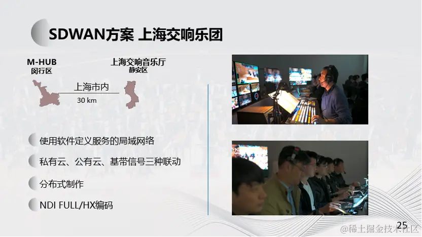 在上海交响乐团远程制作的实例中,我们构建了一张结合了上海交响乐团转播现场、SMT远程制作中心、以及公有云云端所形成的三方网络的融合,形成了一张逻辑上的大型overlay网络,在逻辑上按照视频音频和控制数据彼此分离。