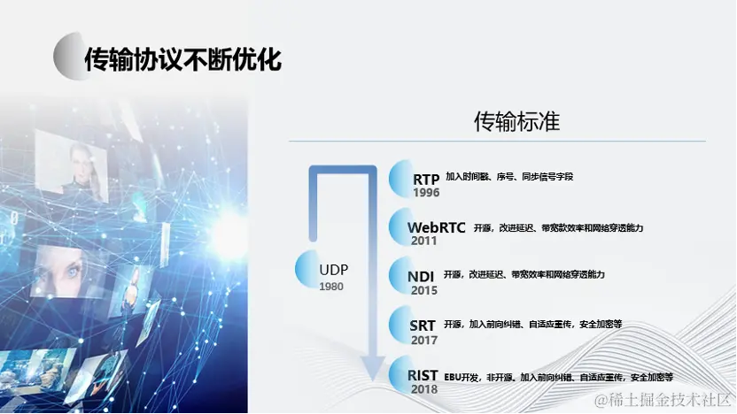 对于网络传输协议而言,SRT、RIST、NDI、WebRTC协议逐渐被广泛使用,这些都是针对实时音视频而专门开发的协议。这些协议为远程制作的实现提供了非常重要的基础保障。