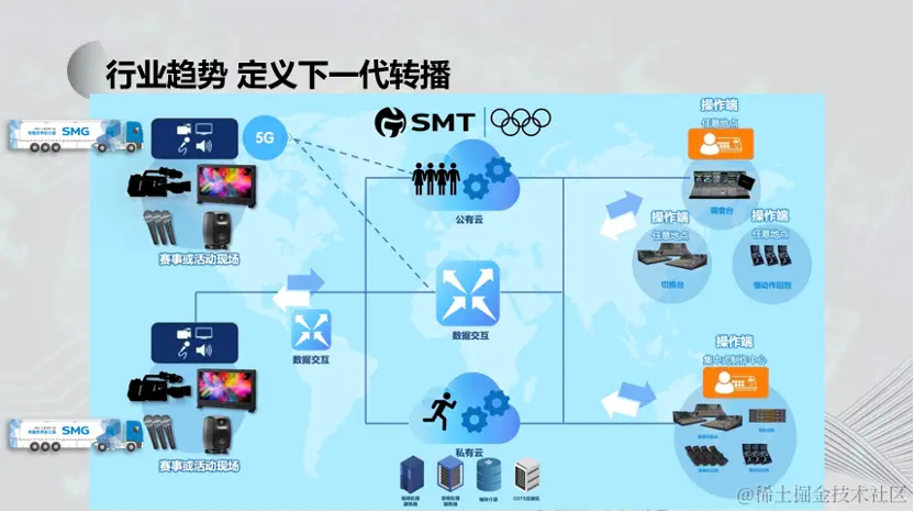 在未来,这将是一个基于混合云架构的、多地协同的远程混合制作模式。计算技术和传输技术将成为未来电视转播行业的奠基石,也就是现在常说的算力和传输力,让传统广电行业从ICT行业特别的分支再次回归ICT行业,再次享受ICT行业的技术发展给我们带来的宏利,这也是我分享的目的之一:传统广电行业并没有完全被时代所抛弃,我们还在努力跟上时代的步伐。