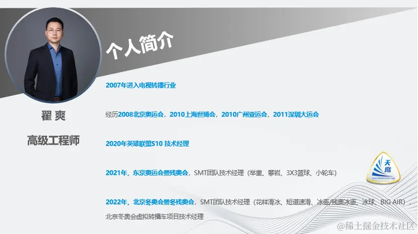 接下来介绍下我自己,我从2007年进入电视转播行业,一直专注于LIVE BROADCASTING,经历了各项重大赛事的转播活动。