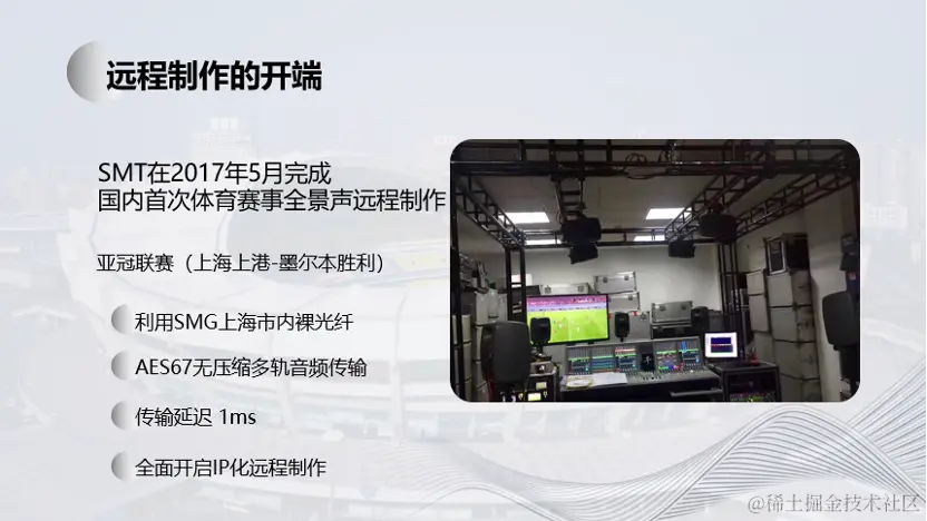 SMT在国内较早的进行远程制作的研究和实践,最早的远程制作是2017年的亚洲足球冠军联赛上海上港队主场迎战墨尔本队的比赛,这场赛事也是国内首次杜比全景声的体育赛事现场直播。当时为了进行杜比全景声的现场制作,需要搭建一个5.1.4的监听环境,但是在上海八万人体育场现场并没有条件去搭建这样的混音环境,而我们最终在SMT转播部的制作中心来进行搭建,采用了远程制作的方式在SMT制作中心来完成这场比赛的直播声音信号的制作。结合当时在广电领域刚刚发展起来的AES67音频AOIP传输技术,我们将64轨无压缩的音频信号从上海八万人体育场通过IP网络的形式传输到了SMT制作基地。在SMT的制作基地完成了全景声的制作,传输延迟低至1ms。