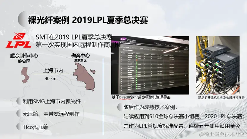 例如2019年的LPL夏季总决赛,这是国内第一次实现远程制作的商用化。利用SMT自有的在上海市内的光纤资源,将信号从梅赛德斯奔驰文化中心,传输至位于40公里外的腾竞体育播出制作中心完成信号的制作与分发。这次的远程制作充分利用了光纤网络高带宽和低延迟的优势,全面采用无压缩和部分TICO(基于帧内4:1固定压缩比和固定压缩编解码时间的方式)浅压缩形式进行前后方的信号交互,实现了前后方100G网络的级连,以及前后方PTP精准时钟的同步。