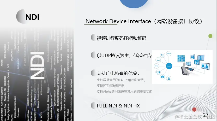 NDI是个音视频的编解码和网络传输协议,它有两重属性,第一是对视频进行编码压缩和解码,第二是在此基础上进行低延时的传输,以UDP协议为主。除了音视频流之外,它还支持广电特有的一些信令,比如导播常用的TALLY和双向通话、支持PTZ摄像机控制、支持Alpha透明通道等常用到的重要功能。