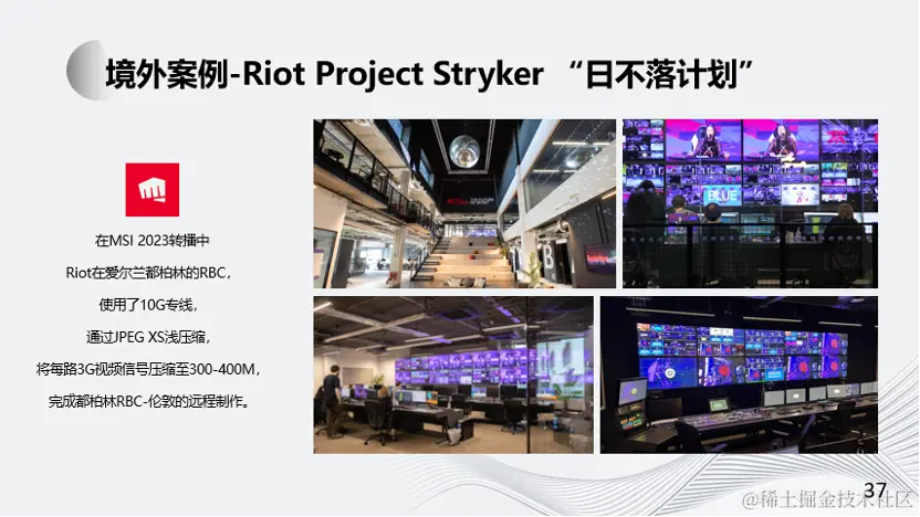 在英雄联盟 MSI 2023转播中,Riot在爱尔兰都柏林的RBC完成远程信号制作,在比赛现场和制作中心之间,使用了10G专线,信号通过JPEG XS浅压缩编码传输,将每路3G视频信号压缩至300-400M,完成了都柏林RBC-伦敦之间的远程制作。