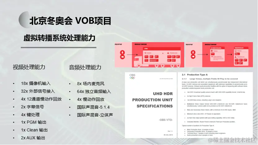 虚拟转播车首次应用在了2022年北京冬奥会冰壶比赛的第四赛道的公共信号制作当中。这个系统总共使用了八台X86架构的服务器完成了传统转播系统各项功能,包括切换台、调音台、慢动作回放、多画面分割监看等等。