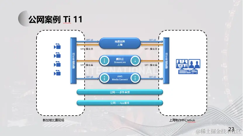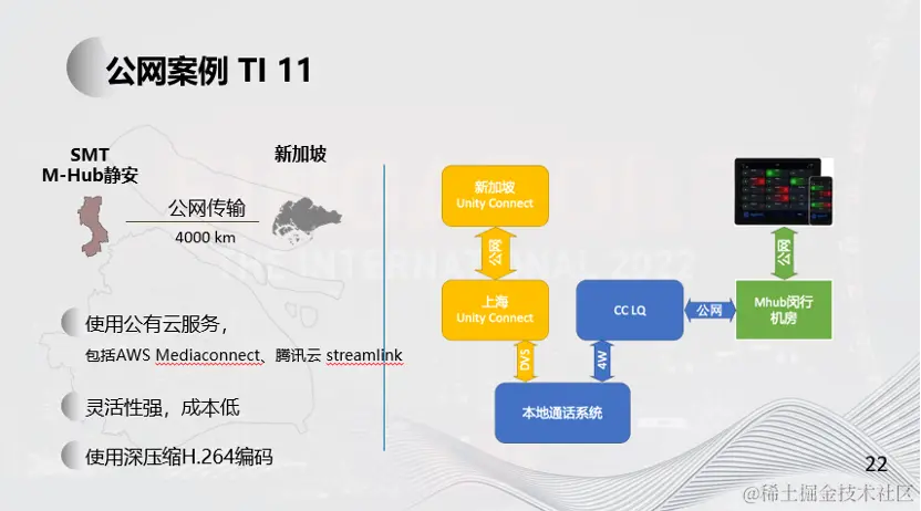 著名的电竞游戏 DOTA2 TI-11国际邀请赛于2022年10月15日-30日在新加坡举行,信号分发在新加坡统一进行,不同内容的视频信号和音频信号,通过主、备各12路采用24Mbps 264·视频编码的SRT流,经公网传输至上海M-hub进行中文包装制作,主、备中文PGM信号经24Mbps编码后使用SRT送回新加坡总控进行全球分发。