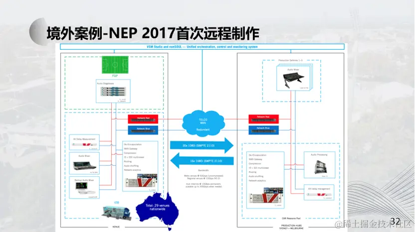 澳大利亚的面积与美国相当,大多数人居住在东海岸和西海岸。在综合评估了各类成本和便捷性后,NEP提出了 “任何人,任何地方”这样一个新的理念,虽然传统的转播工作流程,包括评论员、摄像师和观众在现场看到的一切仍然在现场进行,但制作团队却在距离场馆数百甚至数千公里的制作中心中工作。