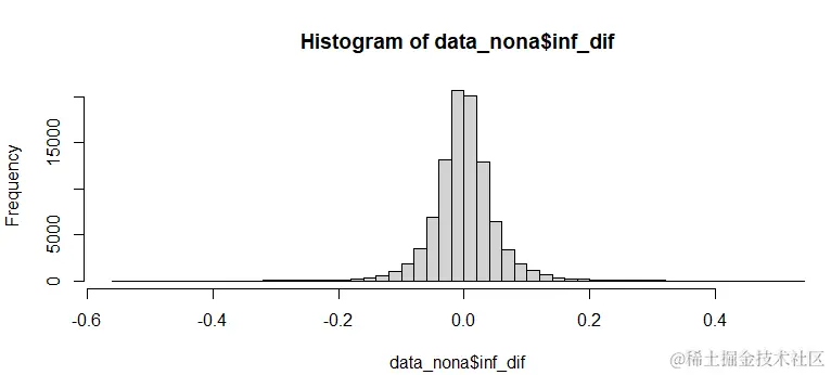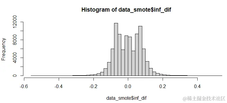 最后,为了比较一下我们执行SMOTE算法与SMOGN算法的结果,可以绘制一下data_nona中,目标变量inf_dif的直方图,breaks = 50表示将直方图分成50个条块。