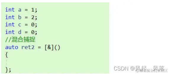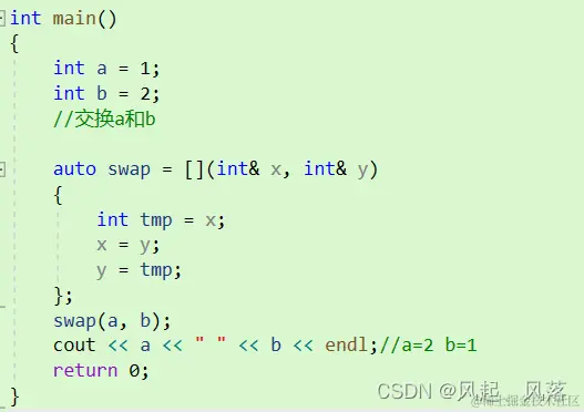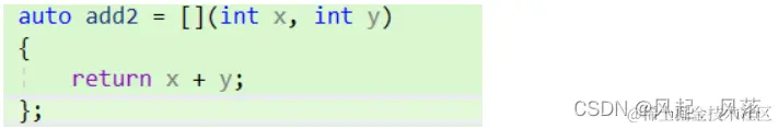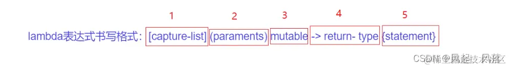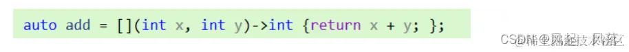 捕捉列表:不可省略,若不进行任何捕捉,则写成 [] 参数列表:存在两个参数 x 和 y 异变:不使用时,可省略 返回值类型:是可以省略的,编译器会自动推导 (但一般不建议省略) 函数体:要注意内部是要有分号的,代表语句结束