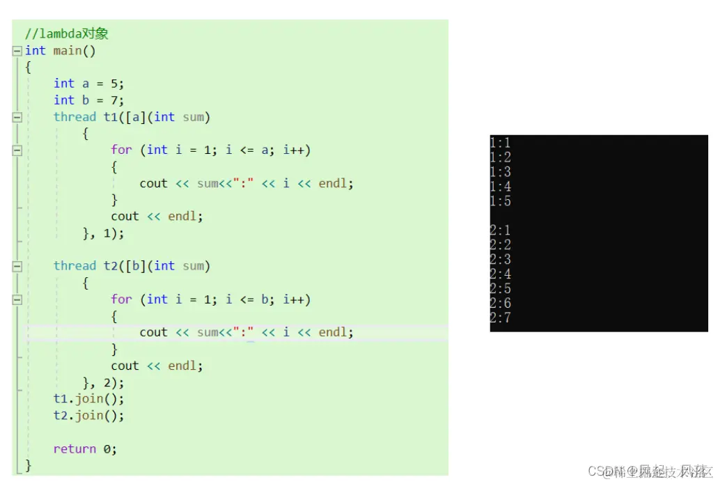 使用lambda对象 作为可被调用对象 通过lambda表达式对象, 先将 a进行传值捕捉,将1作为sum ,再进行循环 再将 b进行传值捕捉,将2作为sum,再进行循环