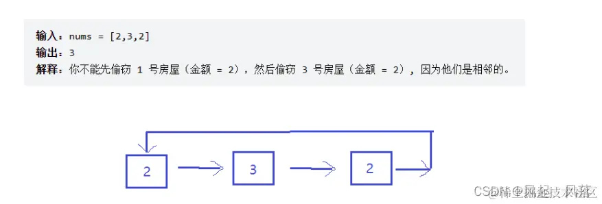 示例 1: 输入:nums = [2,3,2] 输出:3 解释:你不能先偷窃 1 号房屋(金额 = 2),然后偷窃 3 号房屋(金额 = 2), 因为他们是相邻的。 示例 2: 输入:nums = [1,2,3,1] 输出:4 解释:你可以先偷窃 1 号房屋(金额 = 1),然后偷窃 3 号房屋(金额 = 3)。 偷窃到的最高金额 = 1 + 3 = 4 。