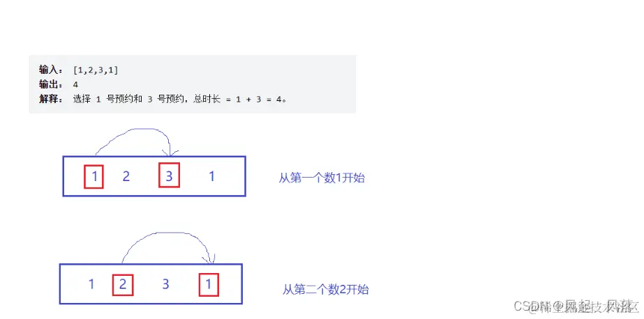 示例 1: 输入: [1,2,3,1] 输出: 4 解释: 选择 1 号预约和 3 号预约,总时长 = 1 + 3 = 4。 示例 2: 输入: [2,7,9,3,1] 输出: 12 解释: 选择 1 号预约、 3 号预约和 5 号预约,总时长 = 2 + 9 + 1 = 12。