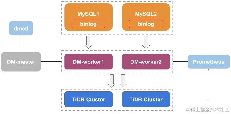 DM 的架构文档可以参考 官方 ,整个集群有三个角色 dmctl/dm-master/dm-worker。