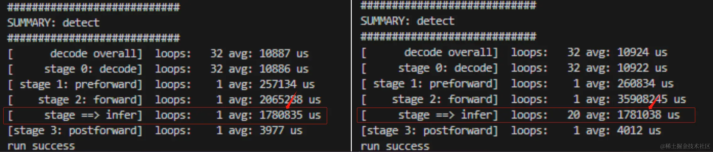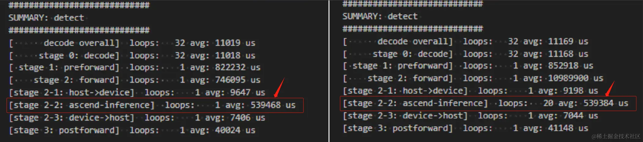 先来看昇腾的,我测试了循环 1 次和循环 20 取平均的推理性能数据,如下,(请忽略不同卡之间的推理性能对比,因为我可能跑的是不同模型~),可以看到两者几乎一致,所以基本可以说明昇腾的第一次推理就是实际推理耗时,并没有 Lazy Loading 策略。