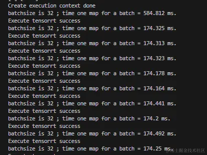 同样的道理放到算法部署或者说算力芯片场景,可能也会涉及 Lazy Loading 的策略优化,比如 CUDA 编程中就会涉及 Lazy Loading 的概念。既然 CUDA 有,那么这样的策略也会直接辐射到英伟达系列的 GPU 硬件部署上,体现的现象就是,比如用 TensorRT 进行模型推理的时候,第一次推理耗时明显过长,后续马上平稳,这不是一个渐变的过程,而是一个突变的过程。口说无凭,下面是我在英伟达平台上用 TensorRT 推理一个 bs=32 的模型的耗时数据,可以看到第一次推理是 584.812ms,后面马上突变到 174ms 的样子。可以很好的想象,可以在初始化的时候 "懒",所以在第一次推理的 584ms 中很大一部分时间都是在做 kernels 的 loading。