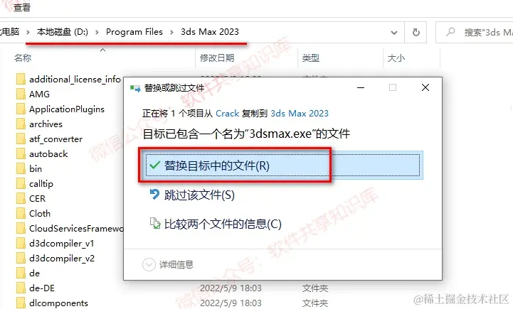 11.粘贴到软件安装路径(第5步设置的路径)下的3ds Max 2023文件夹中,点击“替换目标中的文件”。