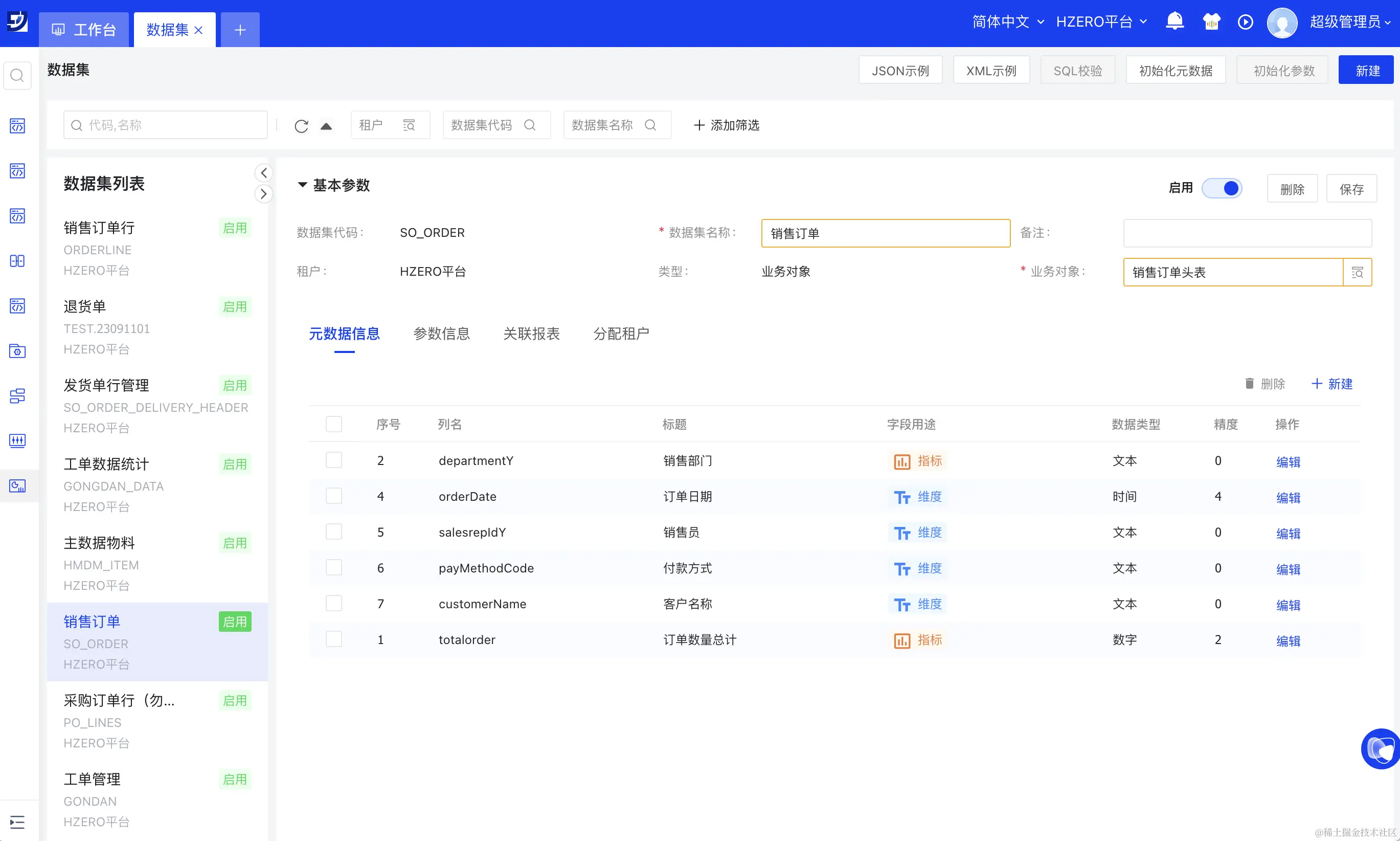 数据集新建成功后,需要进行元数据的新建,输入列名与业务对象的字段编码保持一致,从而使业务对象字段与数据集字段形成映射关系。同时,需要配置元数据的序号、标题、数据类型、精度,并选择将该字段作为元数据的维度或指标字段进行使用。