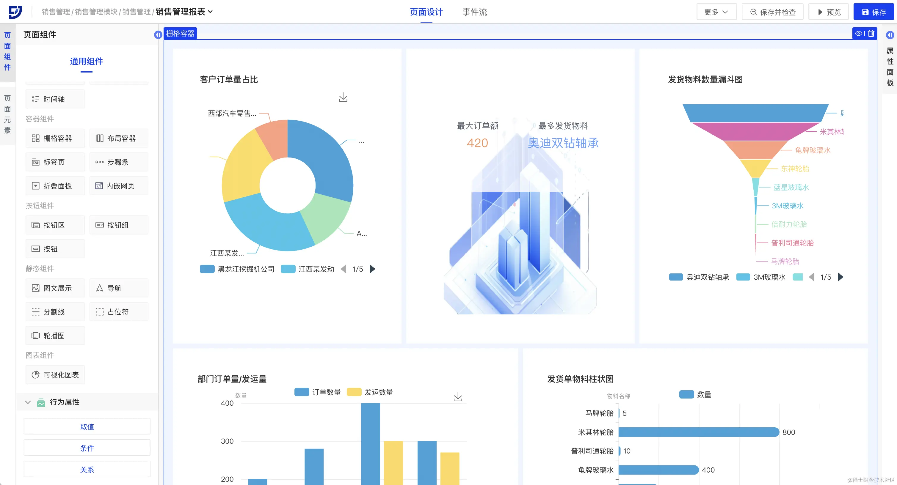 在飞搭设计器内,可视化图表组件可以与其他类型的组件结合使用,以构建更美观的页面。例如,在销售报表页面的搭建过程中,将可视化图表组件与栅格容器组件相结合,将不同类型的图表组件嵌入到栅格容器中不同比例与大小的单元格内,以使报表页面的布局更加合理。在设计和构建页面时,通过充分利用设计器的功能和组件库,能创造出更加美观、实用和易于使用的页面。
