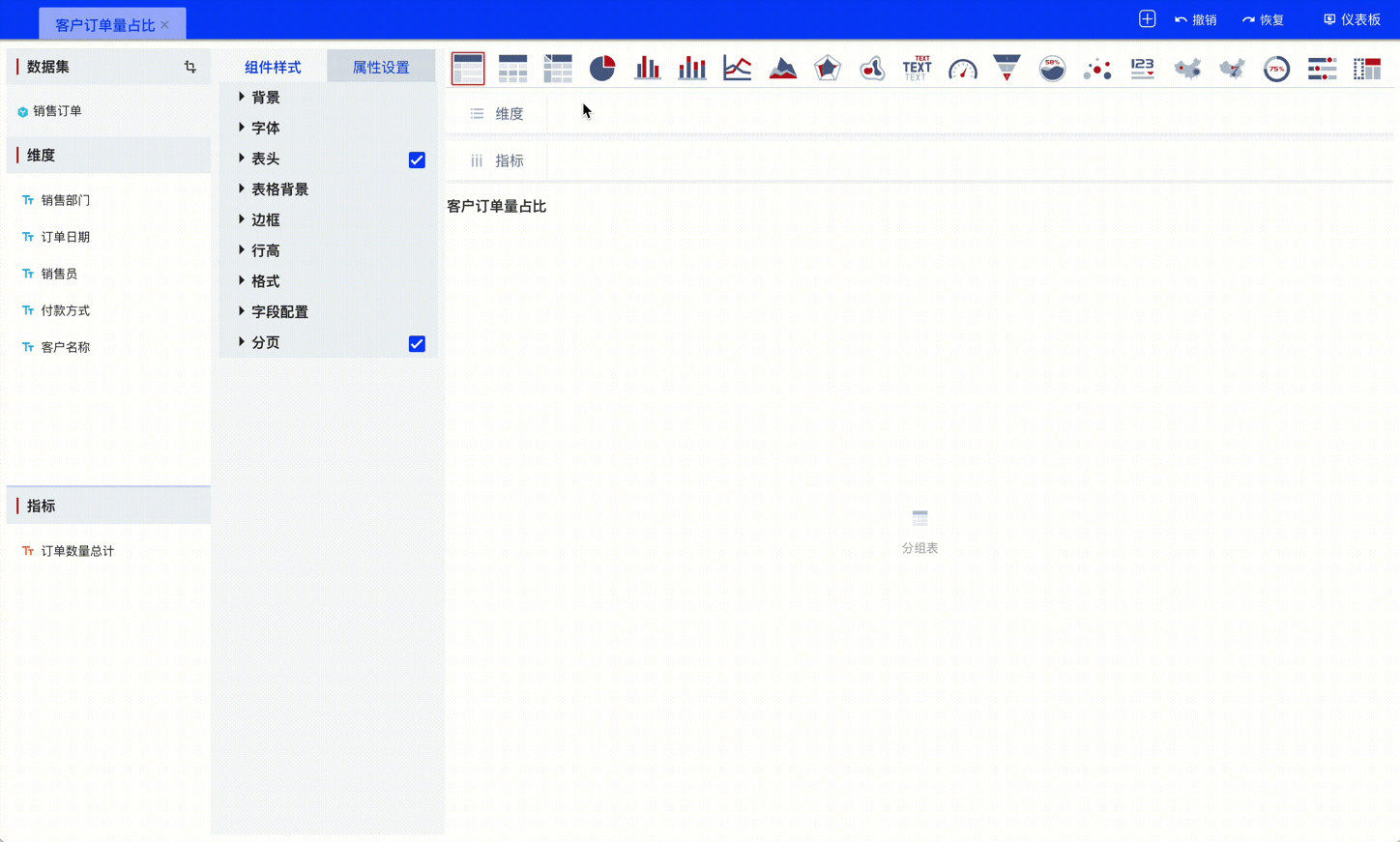 数据集是仪表板中图表组件的数据来源,目前已支持将 aPaaS 业务对象作为数据集的数据来源进行使用。在销售管理场景下,以设计一个客户订单量占比饼图为例: